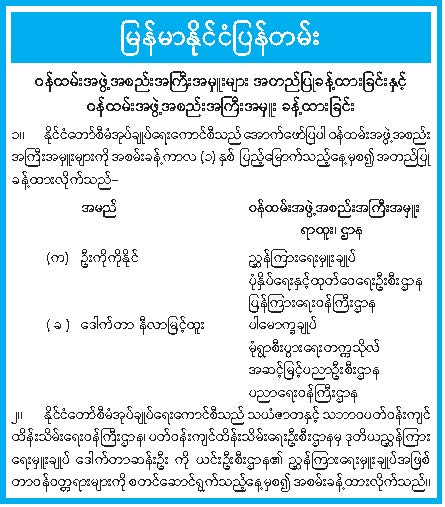၁။ ပြည်သူ့စစ်မှုထမ်းဆင့်ခေါ်ရေးဆိုင်ရာကိစ္စရပ်များနှင့်စပ်လျဉ်း၍ သိရှိလိုသည်များကို စုံစမ်းမေးမြန်းရန်နှင့် သတင်းပို့တိုင်ကြားရန်တို့အတွက် တိုင်းဒေသကြီးနှင့် ပြည်နယ်အသီးသီးရှိ ပြည်သူ့စစ်မှုထမ်း ဆင့်ခေါ်ရေးအဖွဲ့များ၏ အောက်ပါဖုန်းနံပါတ်များသို့ ရုံးချိန်အတွင်းဆက်သွယ်နိုင်ပါကြောင်း ထုတ်ပြန်အပ်ပါသည်-