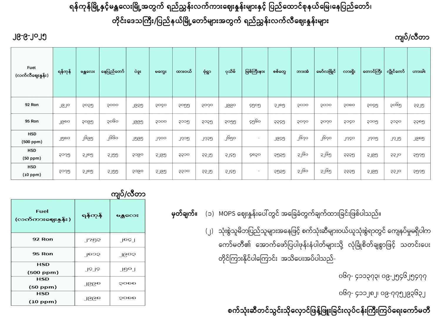 ပြည်ပမှ စားအုန်းဆီထုတ်လုပ်တင်ပို့သည့် နိုင်ငံများတွင် ဈေးကွက်နှင့် ဈေးနှုန်းဖြစ်ပေါ်မှု များအရ ၂၀၂၅ ခုနှစ် စက်တင်ဘာ ၂၉ ရက်မှ အောက်တိုဘာ ၅ ရက်အထိ ရန်ကုန်အထိုင်ဈေး အခြေခံလက်ကားရည်ညွှန်းဈေးနှုန်းမှာ စားအုန်းဆီတစ်ပိဿာလျှင် ငွေကျပ် ၆၆၁၀ ဖြစ်ကြောင်း စားသုံးဆီတင်သွင်းသိုလှောင် ဖြန့်ဖြူးခြင်းလုပ်ငန်း ကြီးကြပ်ရေးကော်မတီက အသိပေးထုတ်ပြန်ကြေညာထားကြောင်း သိရသည်။