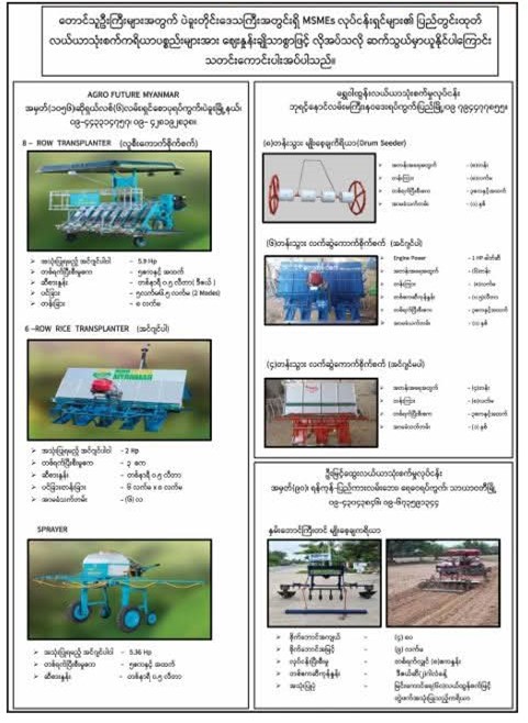 တောင်သူဦးကြီးများအတွက် ပဲခူးတိုင်းဒေသကြီးအတွင်းရှိ MSMEs လုပ်ငန်းရှင်များ၏ ပြည်တွင်းထုတ်လယ်ယာသုံးစက်ကရိယာပစ္စည်းများအားဈေးနှုန်းချိုသာစွာဖြင့် လိုအပ်သလို ဆက်သွယ်မှာယူနိုင်