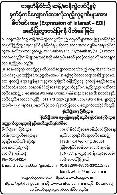 တရုတ်နိုင်ငံသို့ ဆန်/ဆန်ကွဲတင်ပို့ခွင့် မှတ်ပုံတင်လျှောက်ထားလိုသည့်ကုမ္ပဏီများအား စိတ်ဝင်စားမှု (Expression of Interest – EOI) အဆိုပြုလွှာတင်ပြရန် ဖိတ်ခေါ်ခြင်း