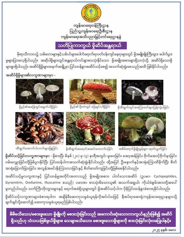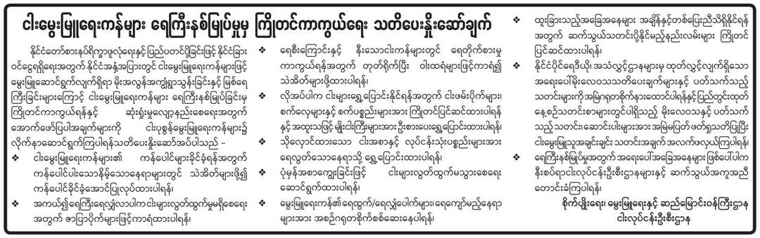 သို့ဖြစ်ပါ၍ မိုးသည်းထန်စွာရွာသွန်းခြင်းနှင့်အတူ လေပြင်းတိုက်ခတ်ခြင်း၊ မိုးထစ်ချုန်းခြင်း၊ မိုးကြိုးပစ်ခြင်း၊ လျှပ်စီးလက်ခြင်း၊ မိုးသီးကြွေခြင်း၊ လျှပ်တစ်ပြက်ရေကြီးခြင်းနှင့် မြေပြိုခြင်း စသည့် သဘာဝဘေးအန္တရာယ်များဖြစ်ပေါ်နိုင်ပါသဖြင့် အဆိုပါဒေသများရှိ ကုန်းမြင့်ဒေသအနီးတွင်နေထိုင်ကြသူများအနေဖြင့် မြေပြိုမှုအန္တရာယ်၊ မြစ်ငယ်၊ ချောင်းငယ်များအနီးတွင်နေထိုင်ကြသူများအနေဖြင့် ရေကြီး၊ ရေလျှံမှုများကို ကြိုတင်သတိပြုရှောင်ရှားနိုင်ပါရန်နှင့် ပြည်တွင်းရေကြောင်းသွားလာရေးနှင့်လေကြောင်းပျံသန်းရေးအနေဖြင့်လည်း ကြိုတင်သတိပြုနိုင်ပါရန် သတိပေး နှိုးဆော်အပ်ပါသည်။