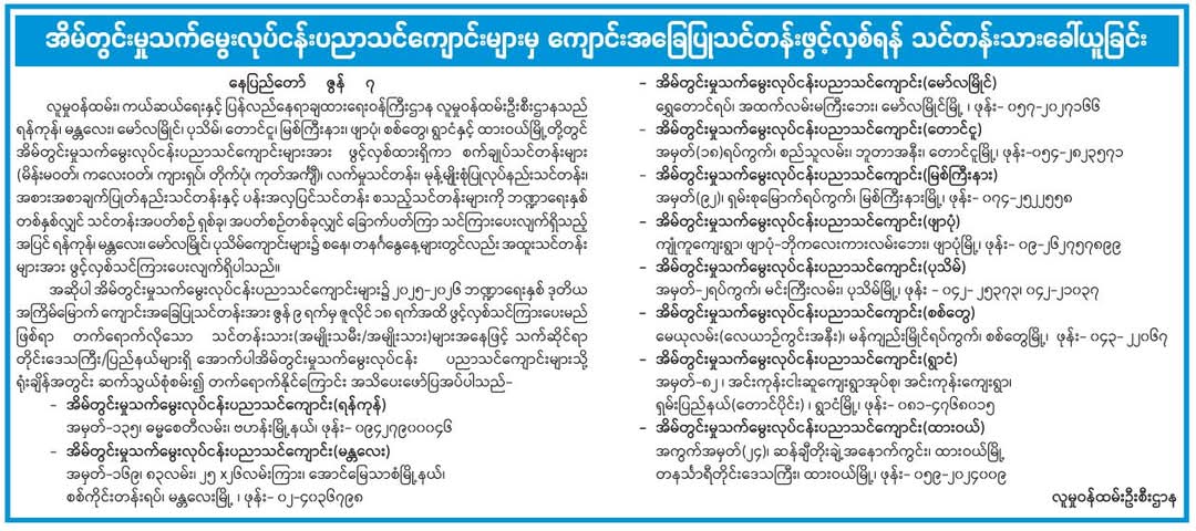 အိမ်တွင်းမှုသက်မွေးလုပ်ငန်းပညာသင်ကျောင်းများမှ ကျောင်းအခြေပြုသင်တန်းဖွင့်လှစ်ရန် သင်တန်းသားခေါ်ယူခြင်း