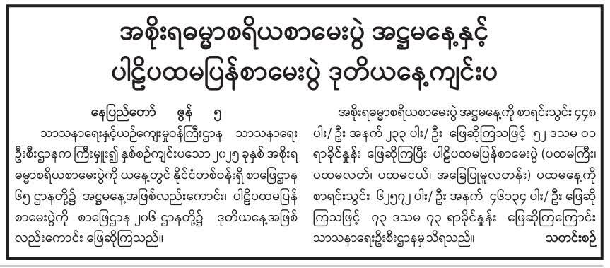 အစိုးရဓမ္မာစရိယစာမေးပွဲ အဋ္ဌမနေ့နှင့် ပါဠိပထမပြန်စာမေးပွဲ ဒုတိယနေ့ကျင်းပ